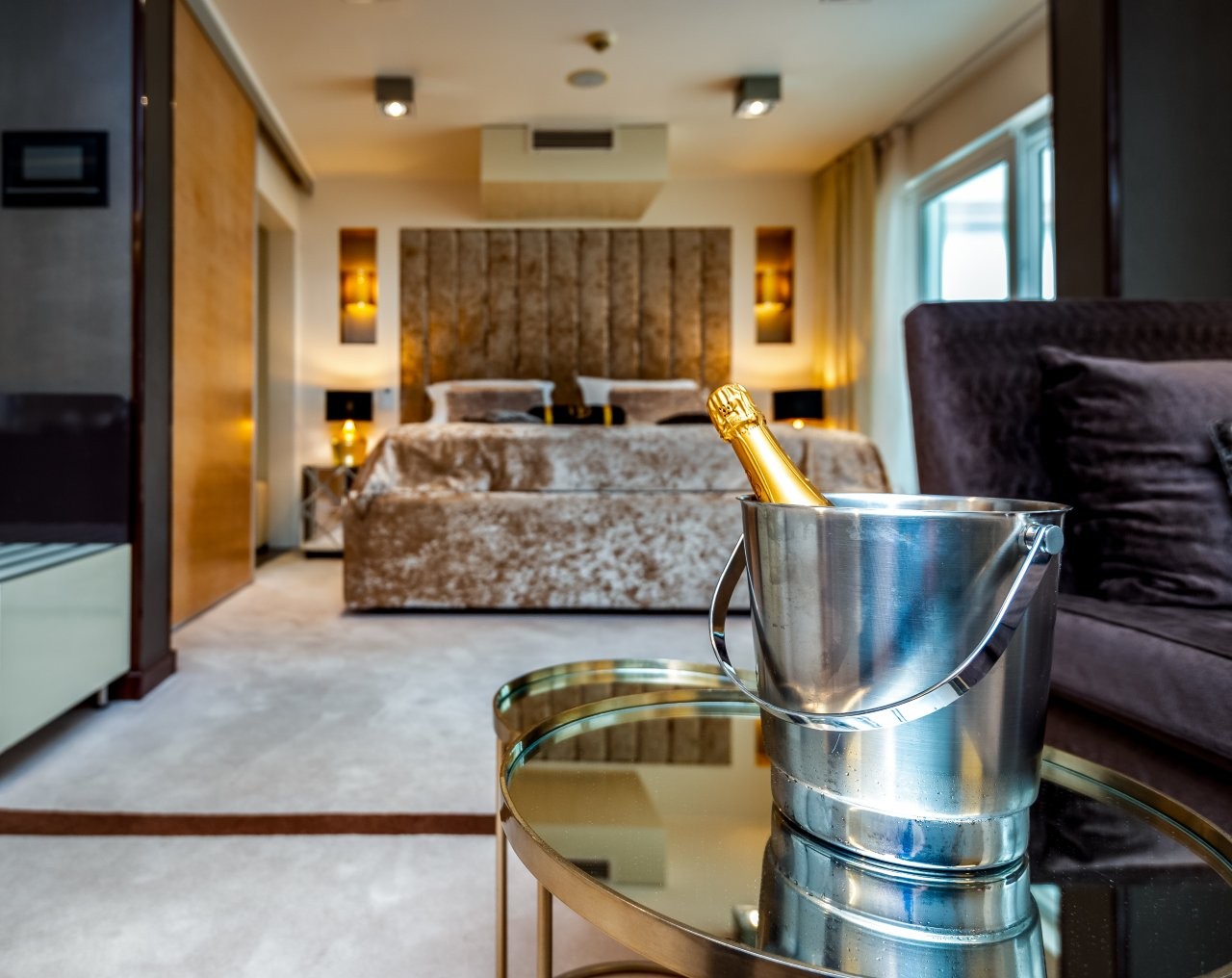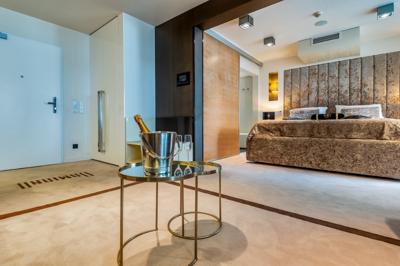 Elegantan suite s king size krevetom, privatnim balkonom i kupaonicom s hidromasažnom kadom.
